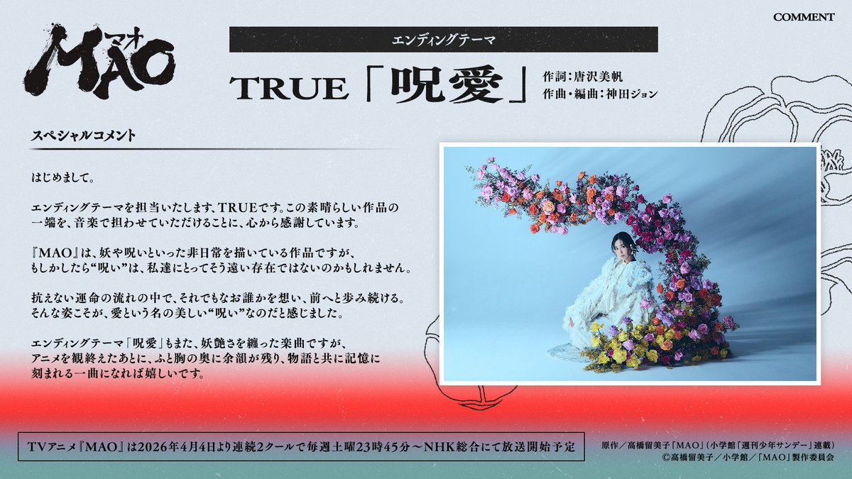 Exciting news for fans of the anime ‘MAO’! The ending theme song has been revealed to be ‘Curse of Love’ by the popular artist TRUE. Check out the details and a preview of the song!