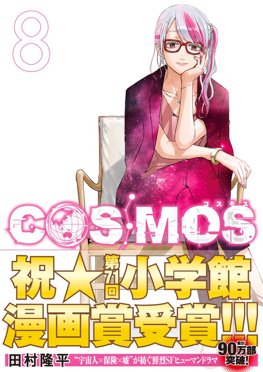 This tweet announces the release of Volume 8 of the manga ‘COSMOS’. It highlights Dr. Akaba in a pink suit and the Shogakukan Manga Award ribbon as identifying features. It encourages readers to purchase the volume from bookstores.