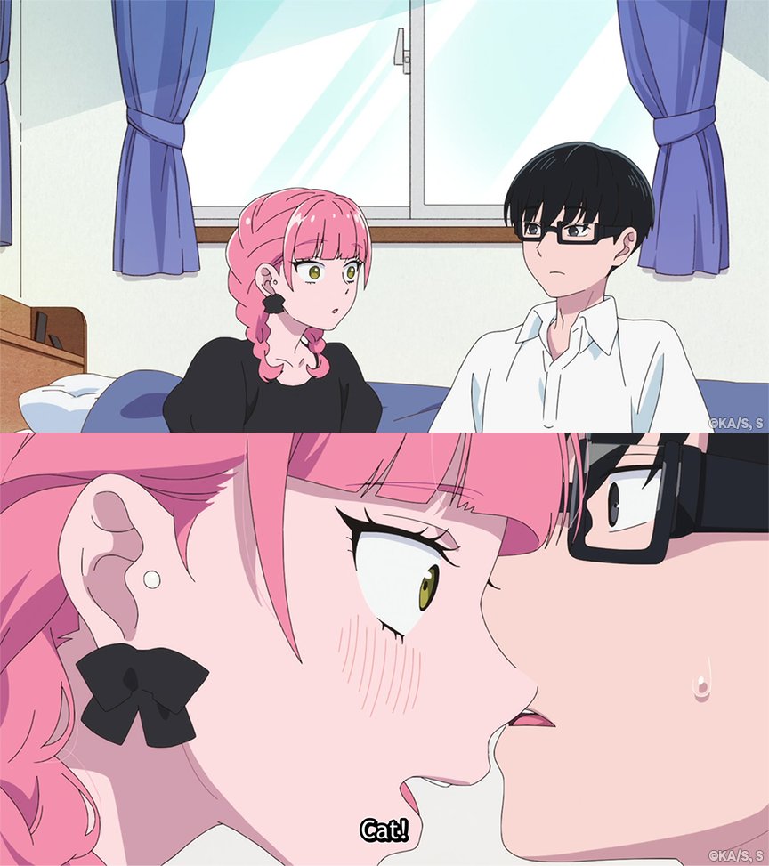 A charming and humorous moment captured from the series ‘You and I Are Polar Opposites’ featuring a cat playfully blocking the view. A delightful scene for anime and cat lovers alike.