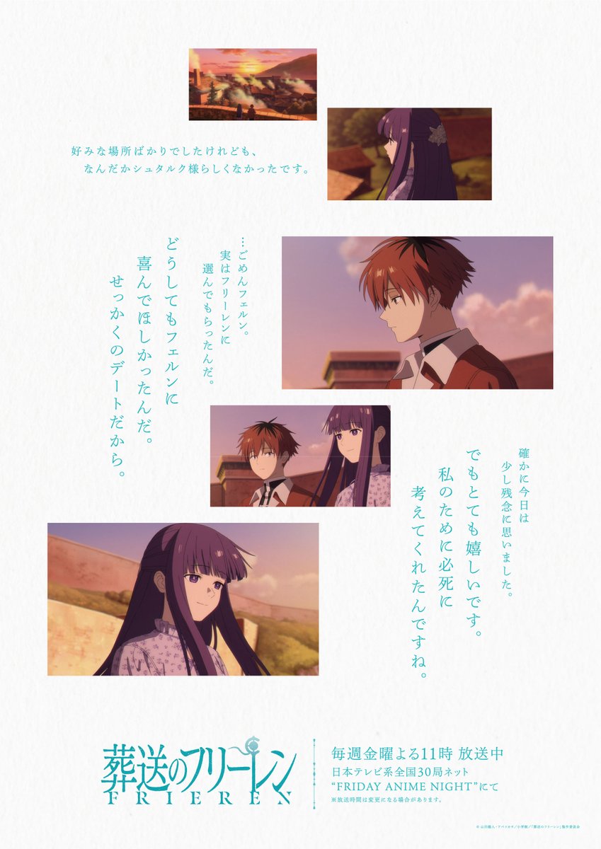 A promotional tweet showcasing a poster from ‘Frieren: Beyond Journey’s End’ featuring a heartwarming scene of Fern. The poster is currently displayed at Akihabara Station in Tokyo until February 15th.