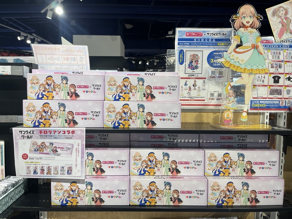 A promotional tweet announcing a collaboration between the Love Live! series and the confectionery brand Tyrolean, featuring limited edition cookies with original packaging.