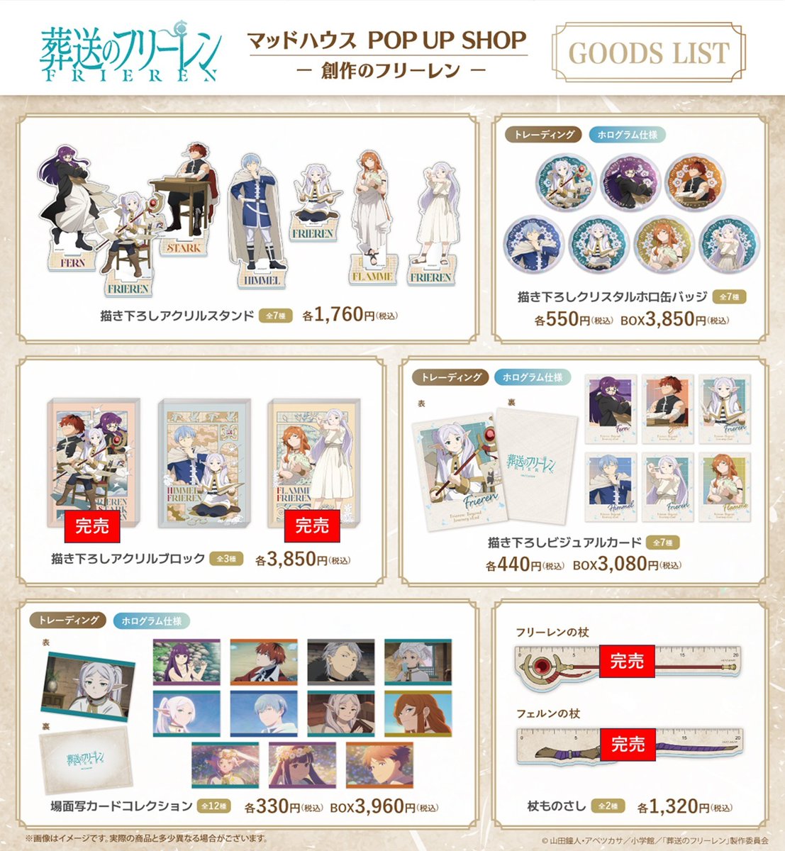The Madhouse pop-up shop dedicated to the anime ‘Funeral Rite of Frieren’ has announced sold-out items. Check the details and event information on the linked page. Re-stocking is currently undecided.