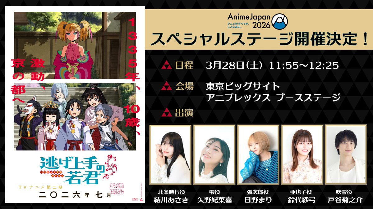 Exciting news for fans of “The Run-Up at Nothing!” This tweet announces a stage event at AnimeJapan 2026, featuring voice actors Yuki Asaki, Fukaki Yano, Mari Hino, Saaya Suzaki, and Kikunosuke Totoya. Get ready for the second act!