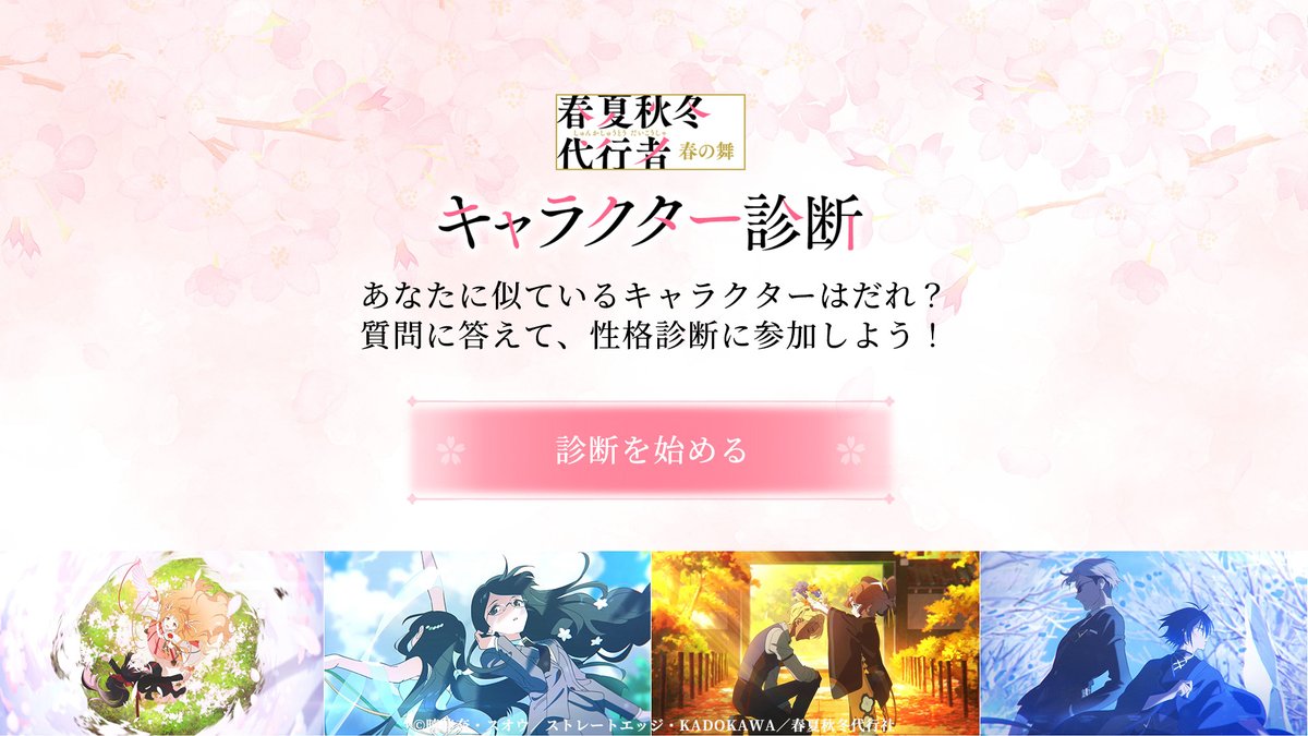 The official website for “Shunkashuto Spring’s Dance” now features a character diagnosis tool. Discover which Substitute or Guardian you are most like by taking the fun quiz! #Shunkashuto #SpringsDance